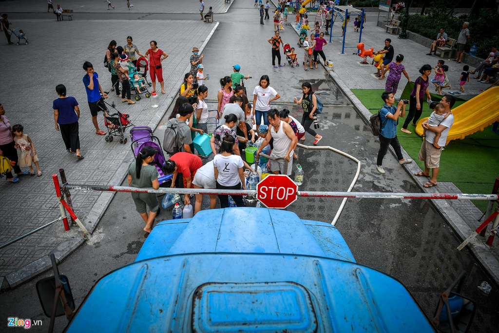 Người dân khu đô thị Linh Đàm (Hà Nội) xếp hàng chờ lấy nước sạch được hỗ trợ để ăn uống, sinh hoạt