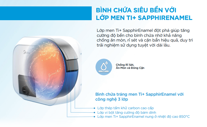 Dù dung tích nhỏ gọn, nhưng bình nóng lạnh Midea này vẫn được trang bị đầy đủ các công nghệ diệt khuẩn, an toàn điện, giữ nhiệt và tăng hiệu suất nước nóng như trên các dòng cao cấp hơn.