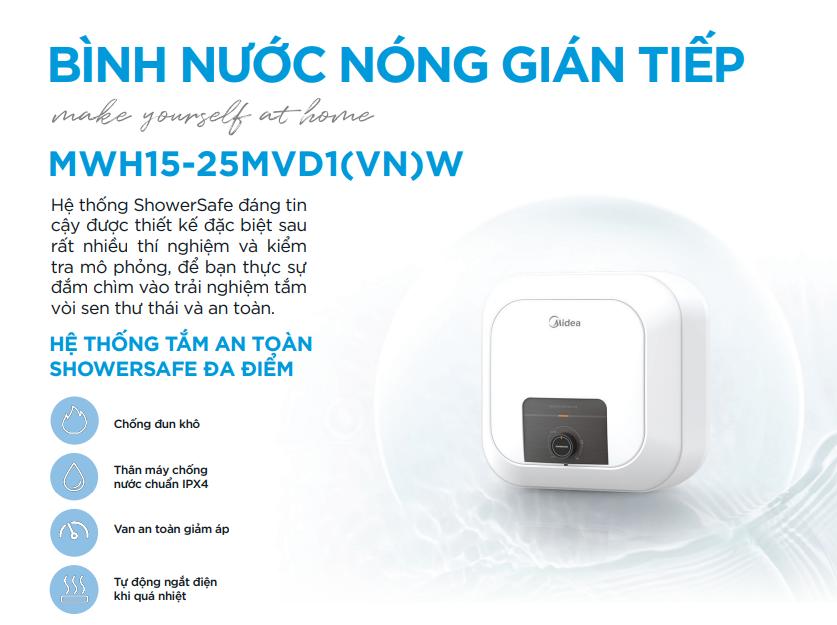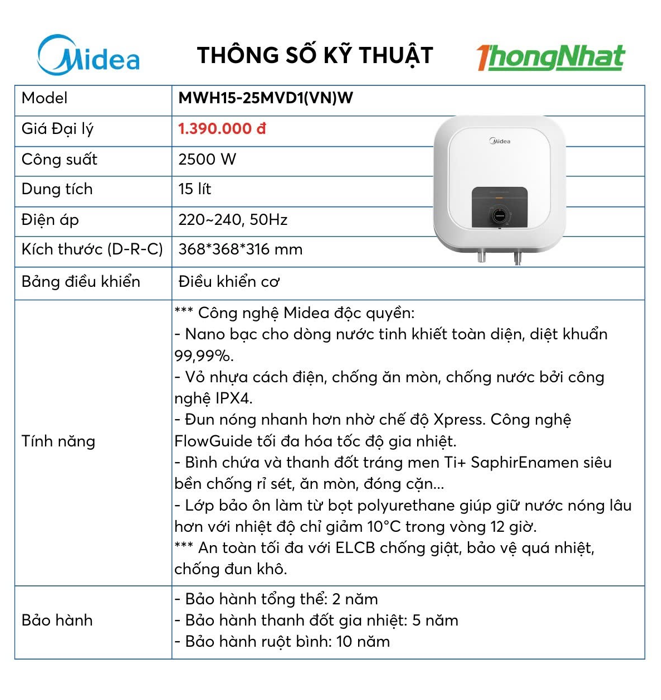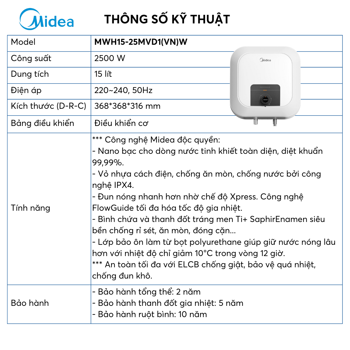 MWH15-25MVD1(VN)W (còn gọi là 25MVD1) là mẫu bình nước nóng gián tiếp Midea dung tích 15L, công suất 2500W, phù hợp cho: